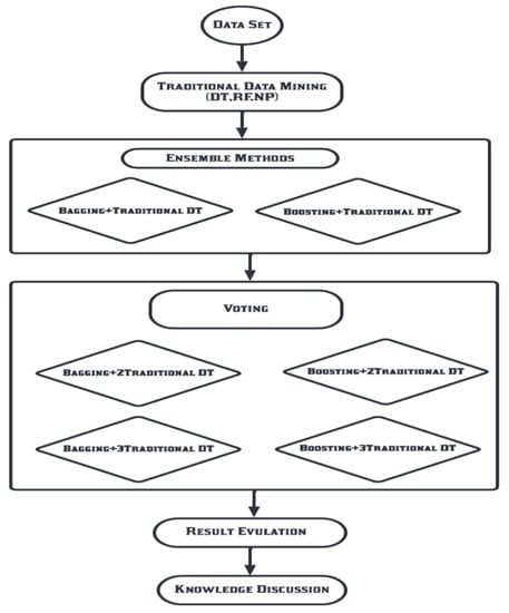 The primary purpose of this paper is to compare the performance and results of each prediction model based on the use of traditional data mining techniques and ensemble methods. Figure 6 illustrates the proposed model that will apply to the data set. First, we collect the data set and prepare it to perform the study. Then, three traditional data mining methods will apply (decision tree (DT), naïve Bayes (NB), and random forest (RF)) to produce a performance model. In addition to the classifiers mentioned earlier, two ensemble methods are used to improve their performance. Boosting, as well as bagging, is applied to enhance the student prediction model’s success. Two and three methods were added to each ensemble technique using the voting process for a more accurate prediction. The model’s last phase will involve evaluating and discussing the results. The data were divided into training and test sets. Each prediction model’s performance was evaluated using K-fold cross-validation. When testing a model, this technique is used to solve the variance problem. In brief, k-fold cross-validation divides the training set into 10 folds. During training, 9 folds are applied before the final fold is tested. As an average of the different accuracies is taken, this better represents the model performance. The method was repeated ten times. All models were run with the WEKA software’s default parameters.
