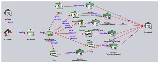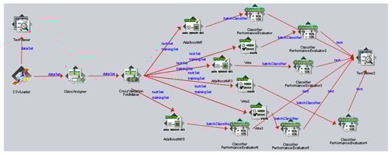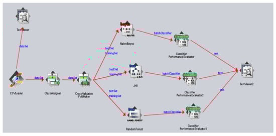 WEKA software was used to conduct the experiments, as we mentioned in the previous section. In Figure 7, implantation for the traditional DM model is explained. First, in WEKA, a data set was uploaded using an operator called CSVLoader to start building the model. The description and details of the selected dataset were explained in the previous section. The dataset contained 17 attributes in total, and all of them were chosen for this study. By linking the “CSVLoader” to a text viewer in WEKA, a table of all the attributes can be shown. Secondly, the data set was assigned to an operator called “ClassAssigner ”to determine the attribute to be considered the class. Third, once the class had been defined, the dataset was connected to the cross-validation operator called in WEKA, “CrossValidationFoldMaker”. It was divided into two parts: training and testing. In each iteration of the cross-validation process, nine subsets were trained for the model and one for the test. As a result, the model’s training and validation were performed concurrently in a single step, which was recognized as a valid test as a result the dataset being used for testing is unidentified. After that, as Figure 7 illustrates, the cross-validation was connected with each algorithm. The data set was divided into two parts: training, to train the algorithm with the training data, and testing, to test the algorithm with the testing data. Finally, the “Classifier PerformanceEvaluator” was applied to each to get the validation of the model and the performance. Moreover, all the models in Figure 8 and Figure 9 were performed with the same procedure as in Figure 7.
