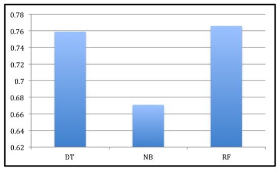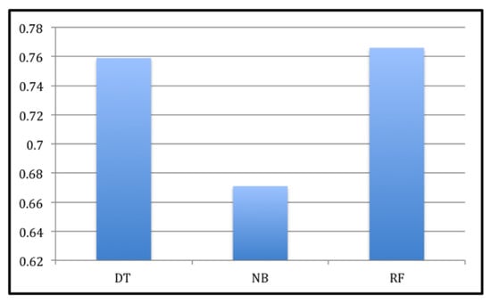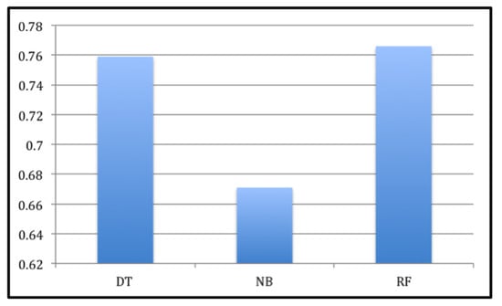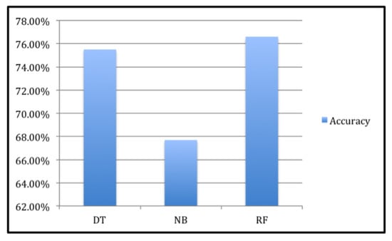 Table 2 illustrates the evaluation measures for traditional data mining. The decision tree resulted in an accuracy of 75.5%, a precision of 0.760, a recall of 0.758, and an F-measure of 0.759. The accuracy was 67.7%, the precision was 0.675, the recall was 0.677, and the F-measure was 0.671, when using naïve Bayes. The accuracy of random forest was 76.6%, the precision was 0.766, the recall was 0.766, and the F-measure was 0.766.
