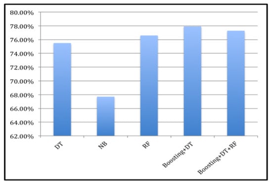 Moreover, Table 3 and Table 4 explained all of the accuracy performances for the models using ensemble methods. Overall, the accuracy of performance was improved by using ensemble methods. In naïve Bayes, the accuracy was enhanced from 67.7% (without ensemble) to 72.29% (with boosting). In comparison between bagging and boosting using voting processes to traditional DM techniques, the accuracy of boosting with decision tree achieved the highest value of 77.9%, where the value was 75.5% without ensemble methods, as Figure 11 shows. That is, from 360 to 375 students were successfully classified to the appropriate class labels. Every ensemble method scenario has outperformed the naïve Bayes accuracy except with boosting, which was equal. Figure 11 illustrates how the proposed model enhanced the accuracy effectively when we used ensemble methods with the traditional data mining separately (boosting + DT) and when we combined several classifiers (Boosting + DT + RF) using the voting process.