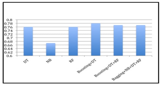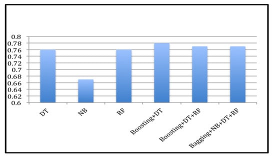 Naïve Bayes has the lowest value of 0.67. At the same time, it increased when applying ensemble methods to 0.72 (with boosting), meaning the number of students correctly classified to the right class labels improved from 322 to 346. Boosting with a decision tree recorded the highest value of precision with 0.78 when in traditional data mining, and the highest value was 0.76. Furthermore, other ensemble classifiers outperformed the traditional DM techniques, as shown in Figure 13.