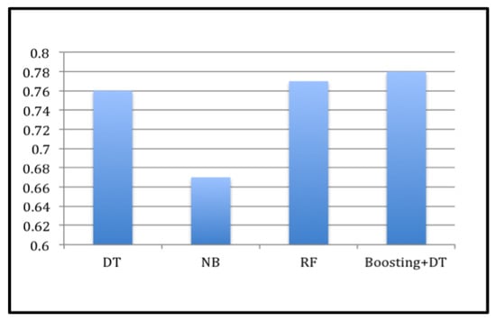 As shown in Figure 17, three scenarios from the proposed model outperformed traditional data mining techniques. Naïve Bayes has the lowest value of 0.67, while it increased, when ensemble methods were applied, to 0.72 (with boosting). Boosting with a decision tree achieved the highest value of recall at 0.78 compared to the traditional DM techniques, with a value of 0.77.