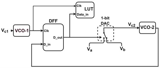 The purpose of this calibration phase is to match the average center frequencies of the two VCOs, during which time the input sensor voltage is disconnected from the system. This can be achieved by employing the two VCOs in a phase-locked loop, where VCO-2 tries to lock itself to VCO-1 and, finally, the settling voltage of VCO-2 will be used as its center biasing voltage for the conversion period. It is known that a digital-intensive architecture would be less prone to TID effects. Besides, an energy-efficient calibration system is favored to reduce extra power overheads. Taking those considerations, during this phase, the two VCOs are connected in a closed loop system involving a D flip flop (DFF) as a single-bit phase detector and a one-bit digital to analog converter (1-bit DAC), as depicted in Figure 2. The DFF receives the output of VCO-2 at its data input and that of VCO-1 at the clock input and its output indicates whether the phase of VCO-2 is leading (binary 1) or lagging (binary 0), with respect to the phase of VCO-1. Here, VCO-1 is biased by a constant biasing voltage Vc1. The output of the D-FF is connected to both a 1-bit DAC and a look-up table (LUT). The purpose of the LUT is to store the series of DFF outputs at each clock cycle during this phase at successive locations on the LUT. The digital output of the DFF is also given to a 1-bit DAC. Based on the output of the DFF, the 1-bit DAC switches between two voltage values Va and Vb, which represent two levels of voltages between which the required average center biasing voltage of VCO-2 is expected to lie. After the end of the calibration period, the average value of the DAC output, , would be equal to the required center biasing voltage of VCO-2, which compensates for the drift of its center frequency relative to VCO-1, thereby eliminating any offset output during the conversion phase.