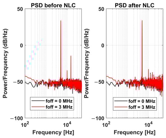 Power spectral density simulation of the output of the proposed offset compensation architecture before and after non-linearity correction with R = 0.125 and L = 512.
