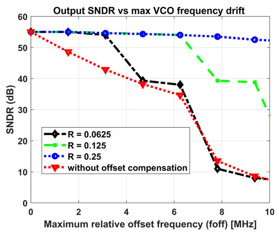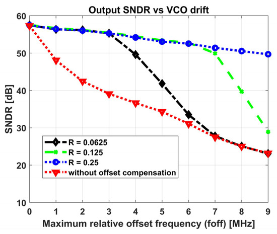 The variation in the output SNDR with the magnitude of the maximum relative offset frequency of the two VCOs () is depicted in Figure 5 for the architectures with and without offset compensation. For the architecture without offset cancelation, the SNDR degrades sharply whenever the relative drift between the two VCOs grows.