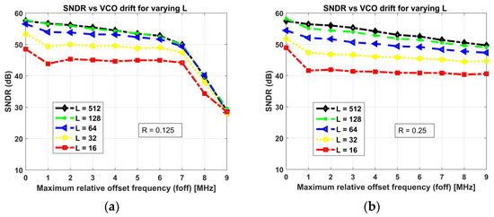 Variation in the simulated output SNDR with the magnitude of maximum relative offset frequency of the two VCOs for varying L and for (a) R = 0.125 and (b) R = 0.25.