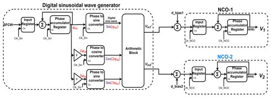 By assuming a sinusoidal input voltage, the input-modulated non-linear VCOs are emulated by cascading a digital sinusoidal wave generator and a numerically controlled oscillator, as shown in Figure 7. The digital sinusoidal wave generator generates two sine waves ( and ) with second and third harmonic contents, as expressed in (10) and (11), where and are coefficients that specify the levels of the second and third harmonics, respectively.