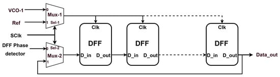 The LUT is implemented with a circular shift register with write and read modes that are controlled by the level of the sampling clock, SClk, as shown in Figure 8. When SClk is low (calibration phase), the LUT will be in writing mode, where it loads the series of bits coming from the DFF phase detector (output of Mux-2) every cycle of VCO-1 (output of Mux-1). When SClk is high (calibration phase), the LUT will be in a reading mode, where it circularly shifts every cycle of Ref (output of Mux-1), thereby delivering consecutive output bits, Data_out, stored in the calibration phase. The size of the LUT, L, is the total number of DFFs in the LUT, whose maximum value is given in (2).