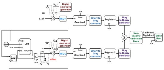The two counters, Counter-1 and Counter-2, count the edges of VCO-1 and VCO-2, respectively, for a duration allotted to Phase-II. The contents of the two counters are sampled by the corresponding registers (Register-1 and Register-2) at the rising/falling edges of the sampling clock (SClk) and subtracted to deliver the final digital output, which is expected to be free from an offset. A non-linearity calibration (NLC) block follows to suppress the major harmonic contents of the digital output that arose as a result of the nonlinearity of the VCOs.