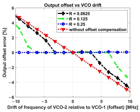 Figure 10 shows the variation in the measured fractional offset error with relative VCO drift for the architectures with and without offset compensation, which are measured for a zero value of the input. The fractional offset error is evaluated as the ratio of the digital output offset value to the full-scale output range expressed in percentage. The architecture without offset cancelation results in non-zero output offsets whenever a relative drift between the two VCO frequencies starts to occur and grows proportionally with it. For the architecture with the offset compensation, the fractional output offset errors are plotted for three values of R. For R = 0.0625, the system cancels up to around ±3 MHz relative drifts, whereas for R = 0.125, the offset cancelation range extends up to around ±6 MHz. For R = 0.25, the structure compensates for any offset in the whole plot. Here, it can be observed that the output offset error is reduced from around 5% to 0.1% for a relative drift of the oscillators, which is close to 10% of the tuning range.