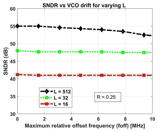 Variation in the measured SNDR of the output with the magnitude of maximum relative offset frequency of the two VCOs for varying L.
