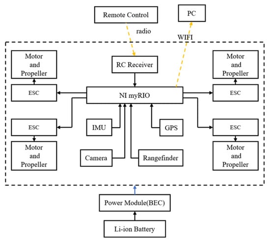 The quadrotor is constructed in this study using commercially available components with glass-fiber reinforced polyamide nylon frames and 3D-printed plastic parts. The system architecture is shown in Figure 1. The bill of materials is listed in Table 1. The main system is depicted within the dashed line box. It has a NI myRIO at the center as the controller and four sets of motors and propellers, which are controlled by an electronic speed controller, IMU sensor, range finder, GPS, camera, and a radio receiver. The controller, NI myRIO, can communicate with the PC through WiFi or receive commands from the remote controller by the radio receiver. It has to be emphasized that the PC currently serves as a ground station and acquires data transmitted from myRIO through WiFi. The conditions of the quadrotor are monitored in the PC interface. The data from the experiments are stored in a memory stick on the myRIO. In attitude control experiments, the desired attitude angle is given in the myRIO program for flight testing. The remote control is used to give attitude angle commands and to steer the quadrotor under realized attitude control.