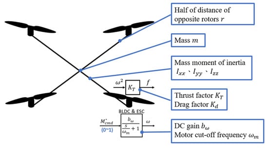 The dynamics equations describing a quadrotor have many parameters to be identified, as shown in Figure 3, including radius, mass, inertia, thrust factor, drag factor, motor gain, and cut-off frequency. The quadrotor developed in this study utilizes the material in Table 1.