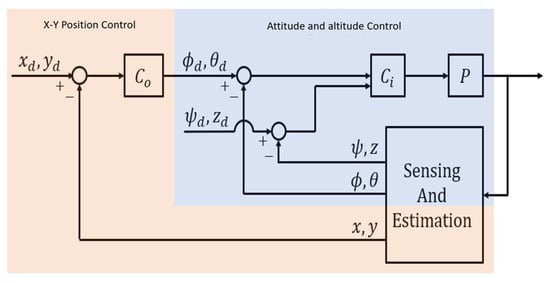 The linearized model is decoupled for each attitude angle control and altitude control. The attitude and altitude control is achieved by using an inner loop control, while the x-y position control is accomplished by an outer loop control, as shown in Figure 6. The attitude and altitude controller provides a thrust and moment command to the actuator based on the desired value and estimated state values to achieve feedback control.