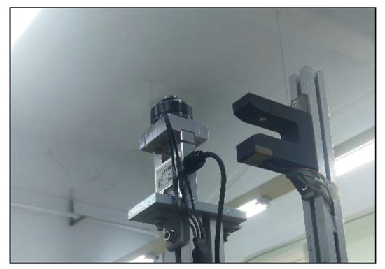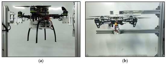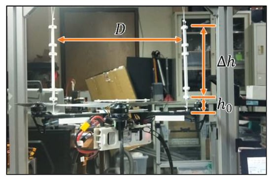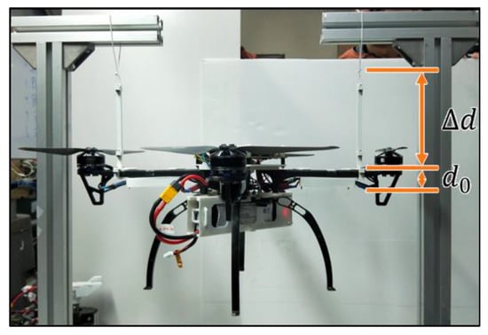 In the experiment, the IMU BNO055 is used to measure the period of a pendulum swinging through the zero-crossing time. The initial pendulum length is unknown, and the is increased by 25 mm each time from 25 mm to 200 mm, as shown in Figure 9. In finding the , the suspension is replaced by wires so that the quadrotor has a rotation degree of freedom in the z-axis, as shown in Figure 10.