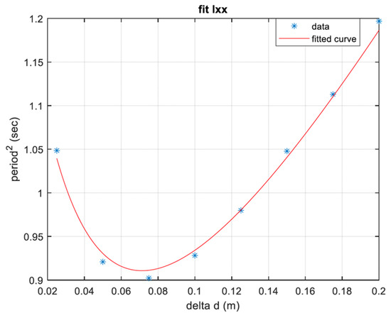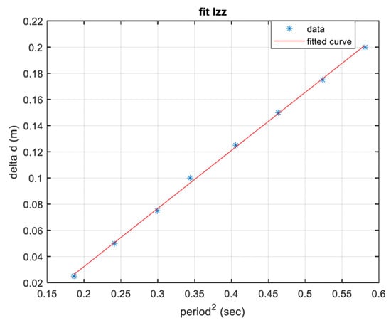 A simple pendulum swinging at a small angle is used to estimate the moment of inertia for the roll and the pitch motion. The moment of inertia is calculated through the length of the pendulum and the period of the pendulum using Equation (20) and is depicted in Figure 4. The represents the wire length to the fixing point of the quadrotor and is the distance from the fixing point to the center of gravity.