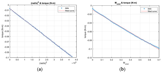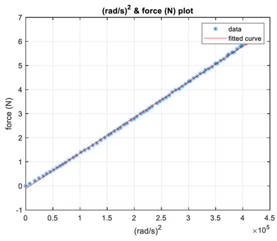When the speed of the motor increases, the thrust and torque will also increase, as described in Equations (10) and (11). Thus, the slope values found by fitting the speed with respect to the trust and the torque curve are the trust factor and the drag factor, respectively.