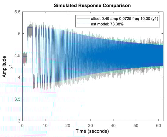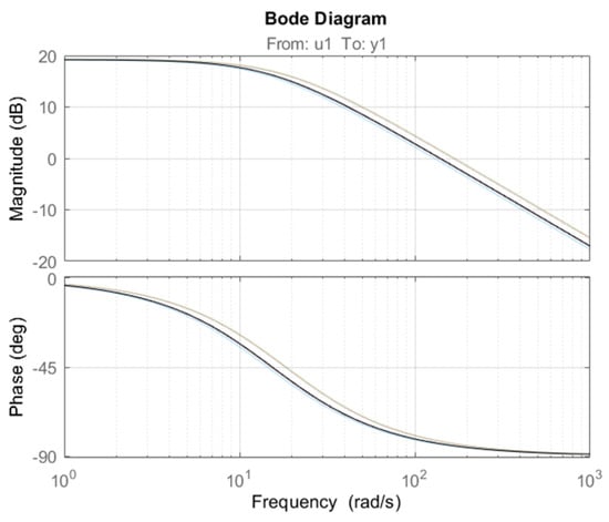 The motor dynamic models, as in Equations (13) and (14), take the modified motor command as the input and the thrust force or the induced torque as the output. By measuring both input and output data, the TFest function from the system identification toolbox of MATLAB is used to obtain the motor dynamic model in frequency domain fitting to find the cut-off frequency.