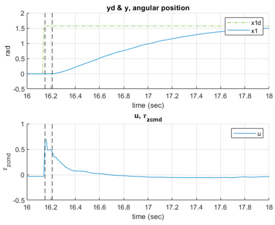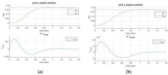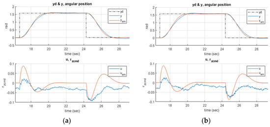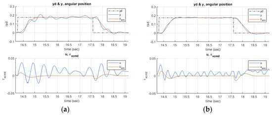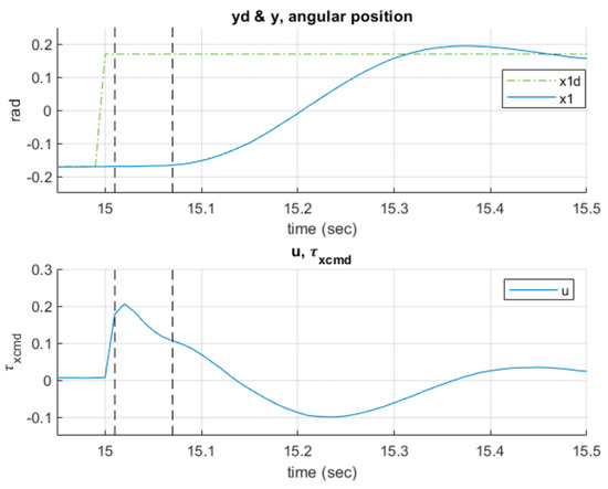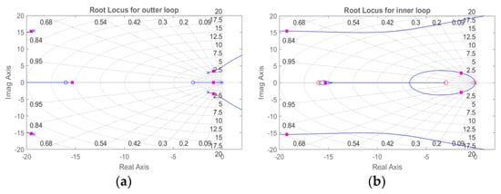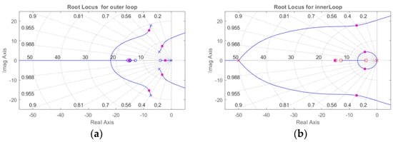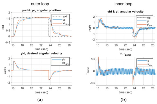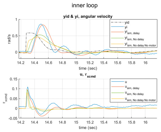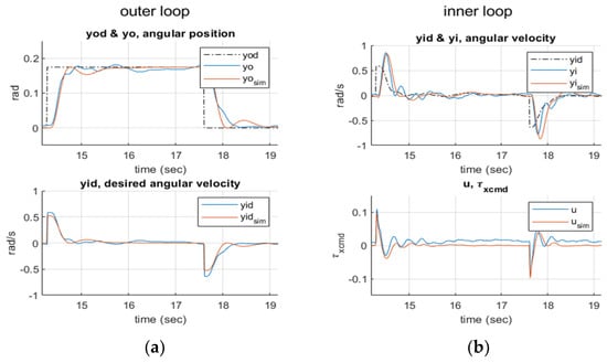 Several linear control synthesizing methods are performed in the control design in this study. First, a cascade PID controller based on online tuning is synthesized. It is constructed with an inner loop for angular velocity control and an outer loop for angle control. The cascade control structure is shown in Figure 7. and are in the format of the PID controller.