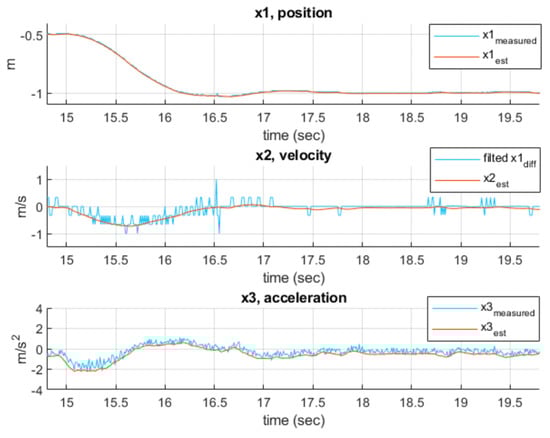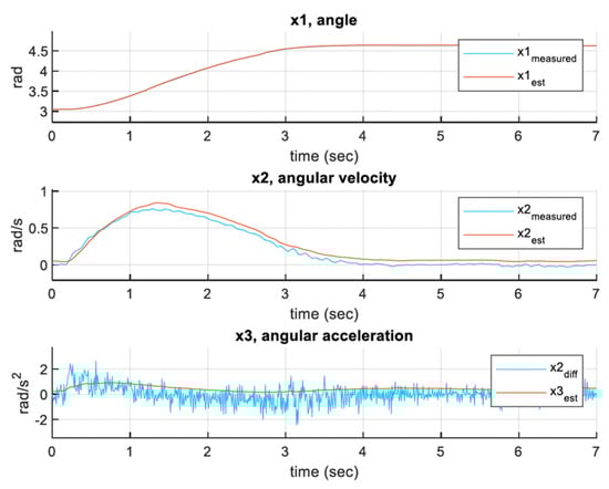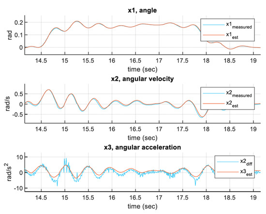 The IMU BNO055 offers an estimated attitude value, but no estimation of angular acceleration. To satisfy the state feedback requirement, the estimation model, including noise, is adapted to fill the requirement. The estimation models used are shown in Equations (22) to (24).
