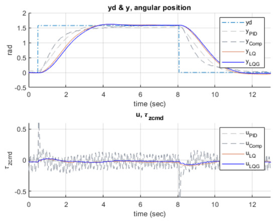 The comparison plots of different controllers in roll angle and yaw angle output response are shown in Figure 44 and Figure 45, respectively. It is observed that LQG has a smaller overshoot and less oscillation than the other three controllers in the roll control. In addition, it is observed with a smaller peak in the control amount when the angle command is switched for the LQG design, compared to other designed controllers.