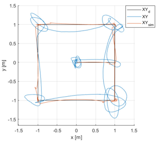 The flight test is conducted on a lawn outdoors with a length and width of 35 m to reduce the effect of surrounding buildings on GPS signal receiving. The steps of the test are to fly the quadrotor to the center of the lawn at a 1-m fixed height accomplished by the attitude and altitude control operated by the user and then hold the position for 10 s to confirm that the GPS signal converges to the current position of the quadrotor as much as possible. After that, the position control is switched on to fly the quadrotor in a predefined 1-m square trajectory. Position data are captured using myRIO with a sampling frequency of 100 Hz.