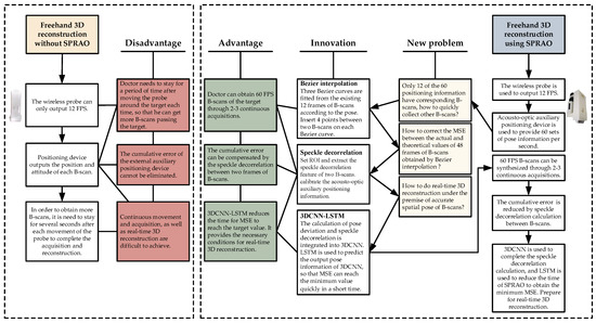 In this paper, a freehand 3D ultrasonic reconstruction method based on deep learning is proposed. This method is named sequence prediction reconstruction based on acousto-optic localization (SPRAO). The research architecture diagram of SPRAO is shown in Figure 1. The advantages and disadvantages of using and not using SPRAO in freehand 3D reconstruction are compared. The organization of this article is designed according to the innovation of SPRAO in Figure 1. The implementation process of SPRAO is as follows: