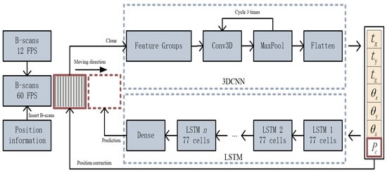 The speckle decorrelation algorithm only uses two frames of B-scans to estimate the displacement and angle. If the cumulative error of the equipment is not considered, the accuracy of the speckle decorrelation algorithm is still worse than that of the method using the auxiliary positioning device directly. Therefore, this paper combines the advantages of speckle decorrelation and acousto-optic positioning equipment, and integrates the two algorithms into 3DCNN, as shown in Figure 6. The steps of the related Algorithm 2 are as follows: