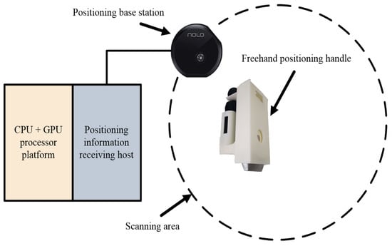 The hardware of SPRAO experimental system in this paper is shown in Figure 8. The hardware includes a customized handle for fixing a wireless ultrasonic probe and acousto-optic positioning equipment, a positioning base station, positioning information-receiving host, and a processor platform. A customized handle, positioning base station and positioning information-receiving host constitute the positioning system, which can output the pose information of the wireless ultrasonic probe in 3D space. After the positioning system and the wireless probe are fixed, the probe outputs B-scan image sequences containing pose information, which are the input data of SPRAO. The processor platform runs the 3D reconstruction algorithm and compensates the cumulative error of the positioning system.