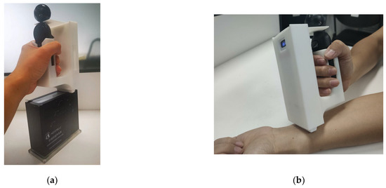 - Customized handle. It is composed of a fixed base, a wireless ultrasonic probe and acousto-optic positioning device, as shown in Figure 9. The wireless probe uses a 128 element linear array probe from Sonostar. The acousto-optic positioning device sends the spatial position coordinates and angle information to the positioning base station, and outputs 60 groups per second. The wireless ultrasonic probe uses a linear array transducer with 128 elements, and uses a 12 FPS frame rate to collect B-scan sequences. The frequency range of the probe is 7–10 MHz, and the depth range is 2–10 cm.