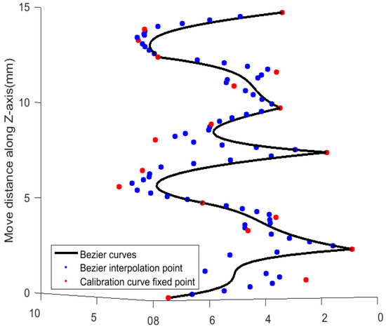 It has been mentioned in the Introduction section that because only 12 FPS B-scans can be obtained after the first acquisition of the probe, there are 48 sets of pose information without corresponding B-scans in the 60 sets of pose raw data per second. Another 48 frames of B-scans need to be inserted through the subsequent acquisition process. The spatial position of each frame of B-scans is actually determined by three points on different lines in the space; therefore, three Bezier curves are needed to provide three points for each plane. The degree of Bezier polynomial used in this paper is not large, and the Bezier curve is more in line with the moving trajectory of the handheld probe in space. Therefore, the data obtained via Bezier interpolation is used as the basis for the improvement of B-scans’ frame rate [42,43,44]. In reference [30], the frame rate of B-scan sequences used in the experiment is 35 FPS; however, it is difficult for a general wireless ultrasonic probe to have such a performance. For example, the frame rate of the wireless ultrasound probe used in this paper is only 12 FPS. In order to obtain a high frame rate in the B-scan sequence, it is necessary to fit several Bezier curves in the original B-scans sequence and calculate the coordinate position of the space insertion point on the Bezier curve.