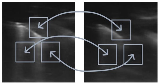 As shown in Figure 2, are the coordinates on different lines of the 3D reconstruction coordinate system through Bezier interpolation. Before speckle decorrelation, 64 × 64 image blocks are taken from around on the first B-scan . Then, ROI of size is extracted from each ultrasound image of the B-scans sequence. The ROI includes three image blocks, as shown in Figure 4.