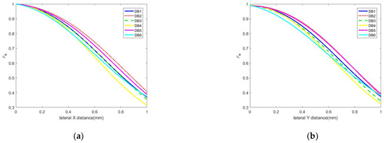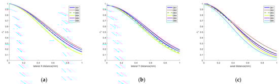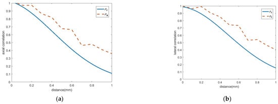 Reference [45] mentions that only in the case of Rayleigh scattering can of Equation (4) be equivalent to in Equation (1). However, in the actual ultrasound images of biological tissues, there are coherent interference and Rayleigh scattering at the same time. Reference [45] calculated speckle decorrelation reference curves for X, Y and Z axes, respectively. It is used to correct the results to adapt to the existence of coherent interference. is the correlation coefficient of Rayleigh scattering. is the correlation coefficient of coherent scattering. is two scattering ratios, 0 ≤ ≤ 1. According to the consistency of the coherent interference, can be obtained as in the following equation: