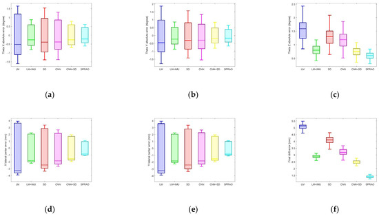 Firstly, box plots are used to compare the intermediate variables of different methods in the process of 3D reconstruction. It can be seen from the diagram that the LM method has a large range of intermediate data errors due to lack of feedback. Since some intermediate data errors cancel each other out in the calculation process, the MSE error of LM does not look so large; however, it is still the largest compared to other methods. The LM + IMU method uses high-precision IMU to provide feedback for LM, which can effectively reduce errors.