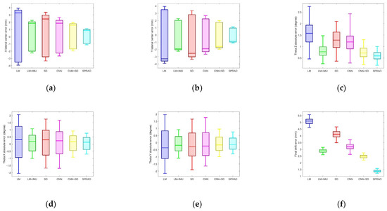Error of different methods for dataset DB1. (a) Theta X; (b) Theta Y; (c) Theta Z; (d) Lateral X; (e) Lateral Y; (f) Drift.