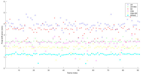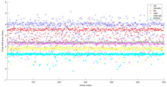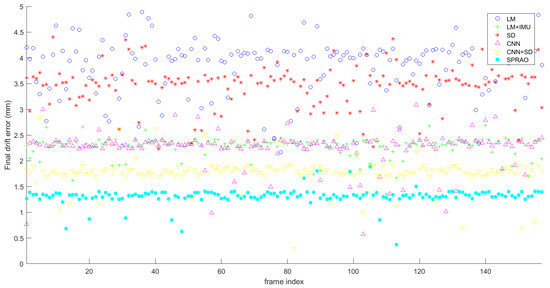 Because the SD method relies only on the speckle decorrelation of B-scans, the error performance of the intermediate data of SD is similar to that of LM, and its MSE error is larger than that of LM. If we only analyze (a), (b) and (c) in Figure 21, Figure 22 and Figure 23, we can see that the absolute angular errors of SPARO, LM + IMU and CNN + SD in the normal vector of B-scan plane are almost the same. From (e), (f) and (g) in Figure 21, Figure 22 and Figure 23, we can see that when calculating lateral distance and drift, the output error of SPARO is significantly reduced compared with other methods. In addition, the dataset of DB5 in Table 2 is large; therefore, the SPARO performance is improved when the size of the dataset increases. This is also why box plots are used.