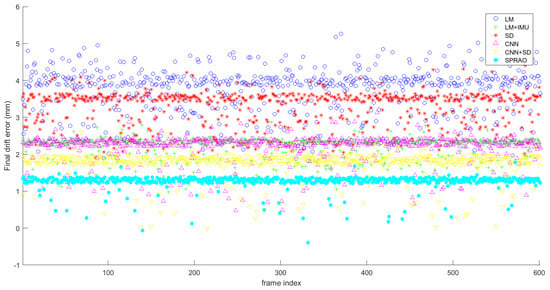 Thirdly, the final drift error of each frame of B-scan is graphically plotted using scatter plot. The final drive performance of each dataset under different methods is shown in Figure 24, Figure 25, Figure 26 and Figure 27. X-axis is ground truth and Y-axis is the results of other models. It can be seen that although the variation range of final drive of SPRAO under different datasets is not the smallest, the average error performance is the best. The error of the final drive is small; therefore, each B-scan can be placed in the correct position in the 3D space, making the reconstruction result more realistic. At the same time, the Pearson correlation coefficient (PCC), R2, MSE, and MAS are added to describe the fitting effect of the prediction results, as shown in Table 4.