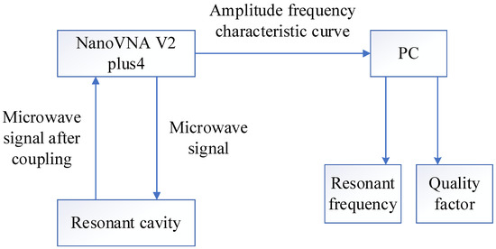 The experimental setup is shown in Figure 1. In this experiment, a self-designed microwave coaxial resonator was used as the measurement sensor. The resonator sensor was connected to the NanoVNA V2 Plus4 vector network analyzer by two coaxial cables (A-info SM-SM-SFD147A, DC-18GHz). The analyzer was developed by HCXQS in collaboration with OwOComm. The frequency of the analyzer ranged from 50 kHz to 4.4 GHz, the frequency resolution was 1 Hz, and the power resolution was 0.01 dB. The analyzer was directly connected to a personal computer by a LAN cable. The data were displayed on the NanoVNA-QT and collected using MATLAB. In the test, the analyzer was operated in the network analyzer mode at a frequency of 2.0–2.45 GHz with 2000 sampling points. The calibration method known as SOLT(T/R) was adopted, in which calibration was performed at the port 1 and port 2 connectors. During the test, the open end of the sensor was completely immersed in the syrup. The working principle of the experimental platform is shown in Figure 2.