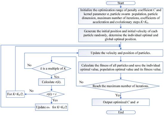 where K is a constant. For any l < k, , it can be seen from formula (9) that [0,1). The larger the , the better the algorithm evolution; otherwise, it becomes worse. When k > 0 and k is a multiple of K, the degree of evolution of the algorithm is calculated. If (t is the threshold value), then the inertia weight is randomly selected from the inertia weight set W as the current inertia weight; otherwise, it is retained. Because the above inertia weights were randomly selected, the currently selected inertia weights performed worse than the previous inertia weights. This study reduced the negative impact of this situation by decreasing the number of iteration steps; that is, when , K is taken as K/2 (if K is an odd number, it is taken as (K + 1)/2); otherwise, K is the initial value. The improved PSO was used to optimize the penalty coefficient C and kernel parameter of SVR. The root mean square error (RMSE) of the syrup brix was taken as the fitness value. The optimization process is shown in Figure 3.