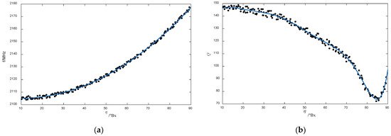 The partial experimental data collected in Section 2.1. are presented in Table 2. The 200 sets of resonance parameters measured were plotted as scatter plots, and the relationship curves between the resonant frequency (f) and syrup brix (), and between quality factor (Q) and , are shown in Figure 5. In the 200 groups of measured data with a brix range of 10.25–89.24 °Bx, f almost increases with the increase of , ranging from 2104.46–2177.50 MHz. There is no linear relationship between Q and , ranging from 72.22–148.86. Some statistical data of the three resonance parameters can be seen in Table 3.