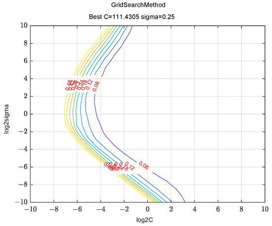 The fitness curve of the PSO is shown in Figure 6. In order to compare the performance of the PSO, grid search (GS) was used to optimize SVR. Figure 7 shows the contour map for SVR parameter selection, and the optimized parameter results of these two methods are listed in Table 5. It can be seen from the results that although GS can take less time, the fitness RMSE is significantly greater than the PSO. The fitness RMSE of the PSO is low (0.74 °Bx), indicating its capabilities for strong optimization.
