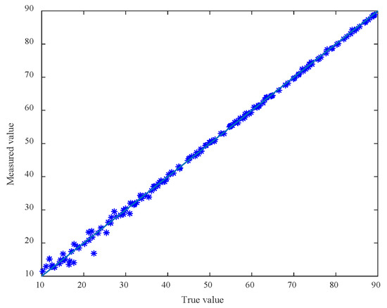A comparison of Table 6 and Table 8 shows that although the three error evaluation indexes in Table 8 are slightly larger than those in Table 6, and that the is slightly smaller than that in Table 6; however, the measurement evaluation indexes in both cases are very close. The MAE is less than 1 °Bx, indicating that the syrup brix calculation model based on the PSO–SVR model can be used for the online measurement of syrup brix in actual situations.