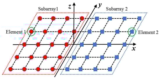 The array antenna composed of two types of elements is shown in Figure 1. The scattering field of an array antenna can be approximately expressed as the product of the element scattering field and the scattering array factors when the mutual influence among the antenna elements is ignored. The scattering fields of an antenna element can be expressed as in Equations (2) and (3). The scattering fields of the two subarrays could then be respectively written as: