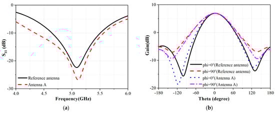 Radiation performance simulation results of the reference antenna and antenna A. (a) S11; (b) far−field patterns.