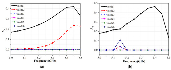 The and the difference of of the dominant scattering characteristic modes of the reference antenna and antenna A. (a) The of the reference antenna and antenna A; (b) difference of of the dominant scattering characteristic modes of the reference antenna and antenna A.