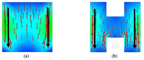 Radiation characteristic current distribution on the radiation patch at 5.1 GHz. (a) Reference antenna; (b) antenna A.