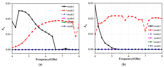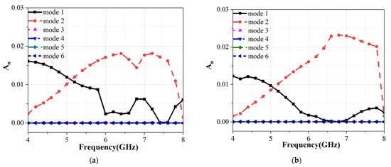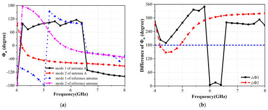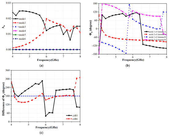 For the x-polarized incident wave, the scattering characteristic mode analysis of antenna A and antenna B is performed from 4.0 GHz to 8.0 GHz. Figure 15 and Figure 16 show the calculations of and of the scattering characteristic modes. It can be seen from Figure 15 that modes 1 and 2 are the dominant modes for antenna A and antenna B. The mode amplitude () is small in the antenna operating band, which originates from co-polarization absorption due to antenna impedance matching. The scattering phase () is shown in Figure 16a and the phase difference between antenna A and antenna B is shown in Figure 16b, where is the phase difference between mode 1 of antenna A and antenna B, and is the phase difference between mode 2 of antenna A and antenna B. There, is 175° at 6.0 GHz and the corresponding values of are about 0.015. Therefore, a cancellation effect of antenna A and antenna B is produced outside of operating band. It can be concluded that the RCSR of an array antenna composed of antenna A and antenna B can be obtained from 4.2 GHz to 6.6 GHz for the x-polarized incident wave.
