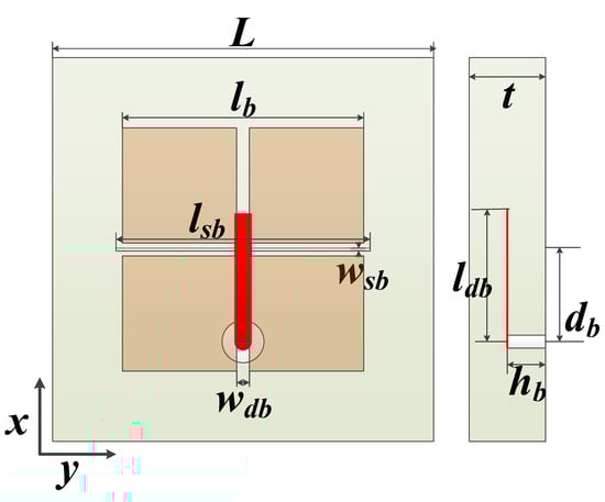 The geometries of reference antenna and antenna A are shown in Figure 2 and their main dimension parameters are shown in Table 1. The reference antenna and antenna A have similar structures and the dielectric material is polytetrafluoron (, ). The lower layer is a ground plane structure with rectangular slots which is used to adjust the antenna resonant frequency. The middle layer adopts an L-shaped coupling feed structure to widen the operating bandwidth. For the reference antenna, the upper layer is a square patch, as shown in Figure 2a. For antenna A, the upper patch is a square patch with two rectangular slots through which the characteristic mode can be regulated, as shown in Figure 2b. For a y-polarized wave, the equivalent electrical length of the scattering current can be increased, which impacts the phase of the characteristic mode.