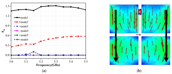 The radiation characteristic modes of antenna B are first analyzed. Figure 11 shows and the characteristic current distribution. It can be seen from Figure 11a that mode 1 is the dominant mode of antenna B. The characteristic current distribution of mode 1 of antenna B is similar to antenna A, as shown in Figure 11b.