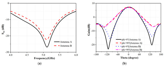 The simulation results of the reflection coefficient (S11) and far-field patterns of the two antenna elements are shown in Figure 12. It can be seen that antenna A and antenna B have the same resonant frequency and similar far-field patterns in both the xoz plane and yoz plane at 5.1 GHz. The operating frequency with a reflection coefficient less than −10 dB is from 4.55 GHz to 5.49 GHz.